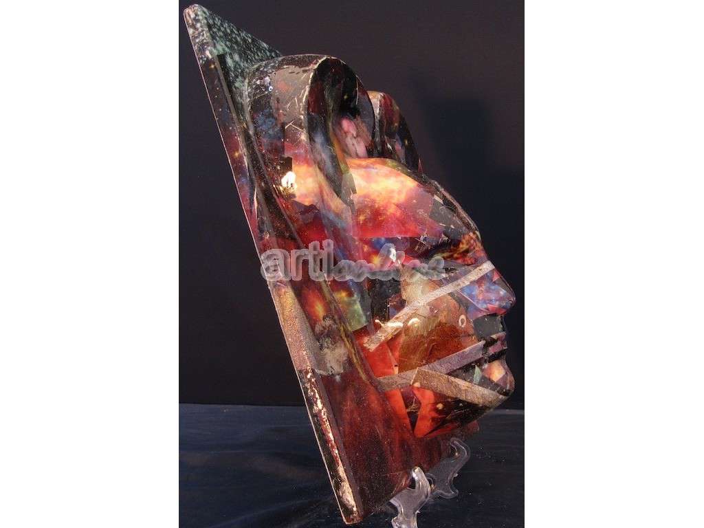 Opera originale n° 1/1 - dimensioni: 29,5 x 23,5 x 12  cm. - base in gesso replicata in stampo,fissata su tavola - decoupage con ritagli di giornale- finitura in poliestere - la firma è impressa sul retro dall'artista - l'opera  è munita di certificato di autenticità compilato e firmato dall' artista
